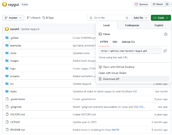 There are two method to get the raygui code and project. Choose either one.