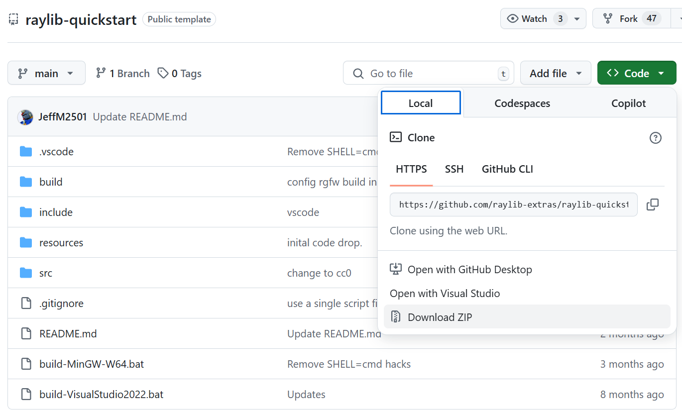 example: git clone https://github.com/raylib-extras/raylib-quickstart.git